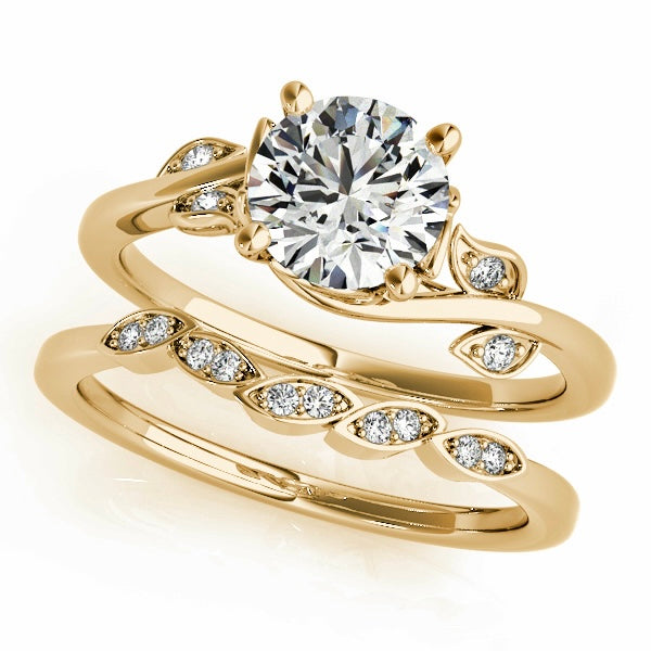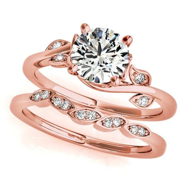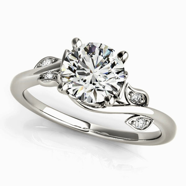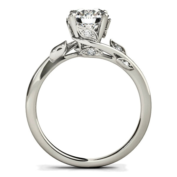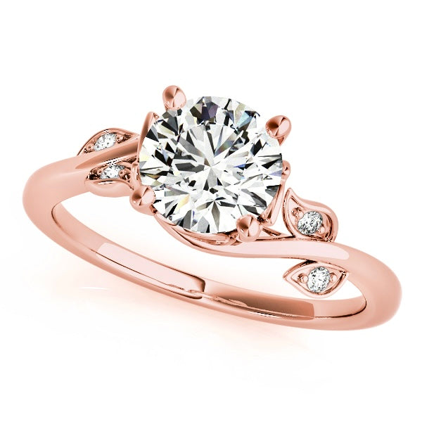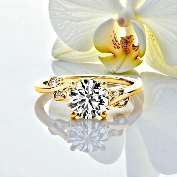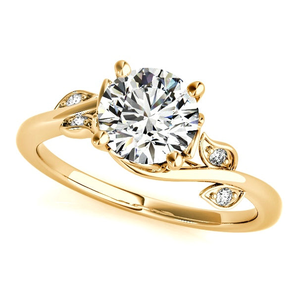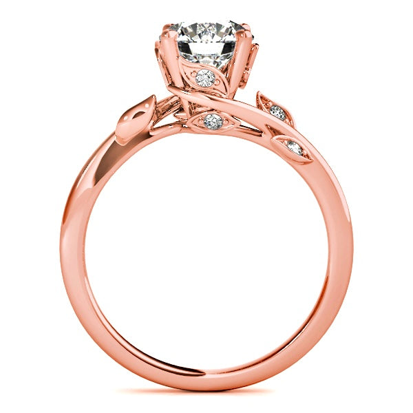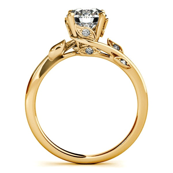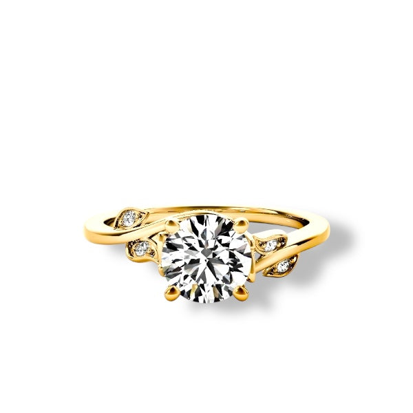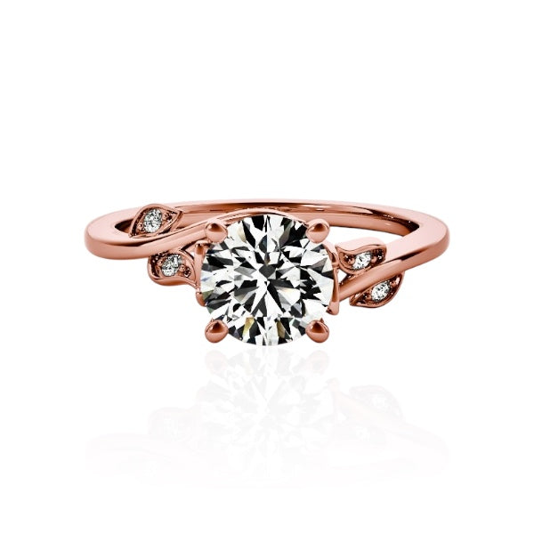 This engagement ring features a 1 carat lab-grown diamond, set in solid 14K gold with an organic, flowing design that feels timeless. The gently sculpted band curves naturally around the center stone, accented with delicate leaves adorned with diamonds that add soft sparkle without overpowering the design.