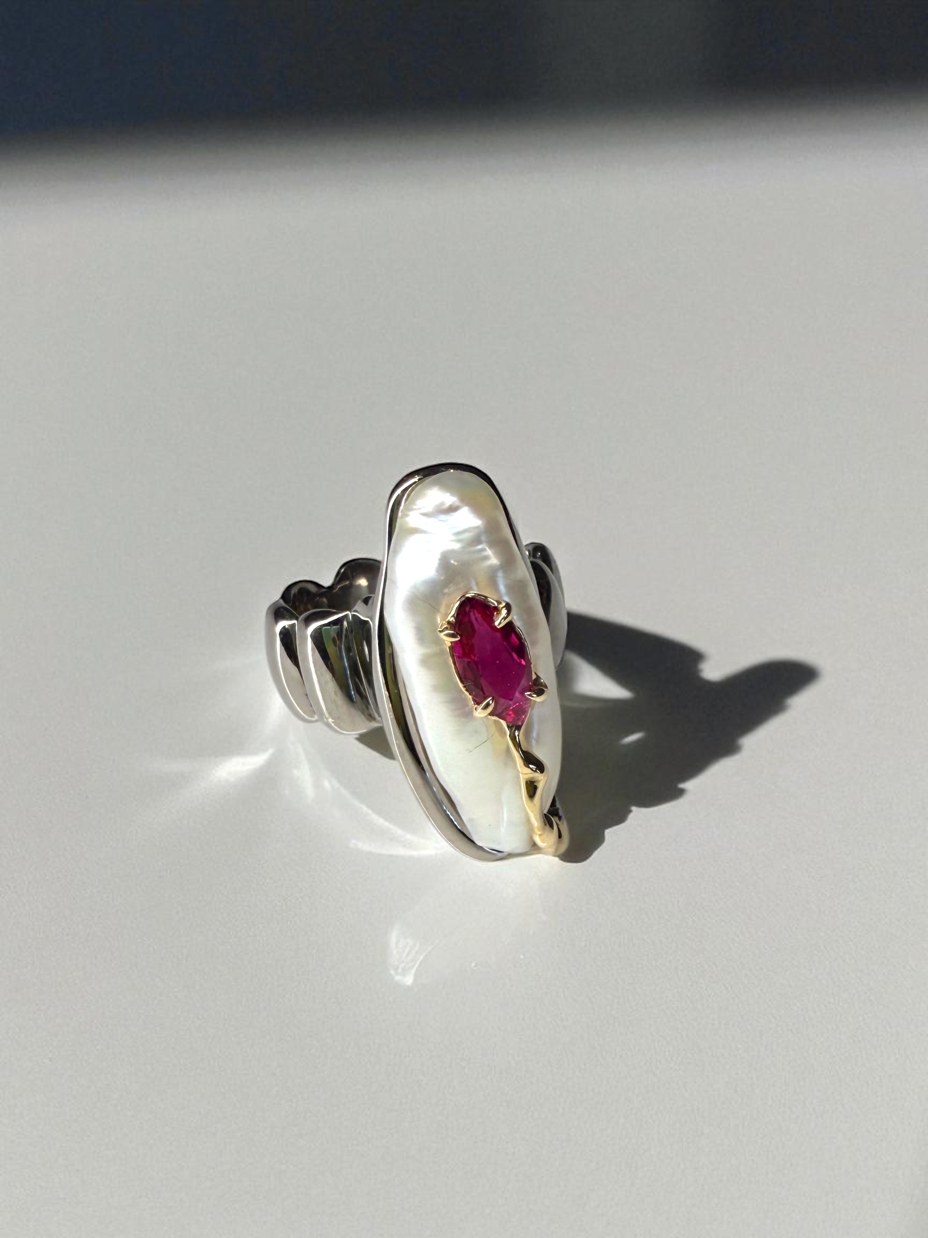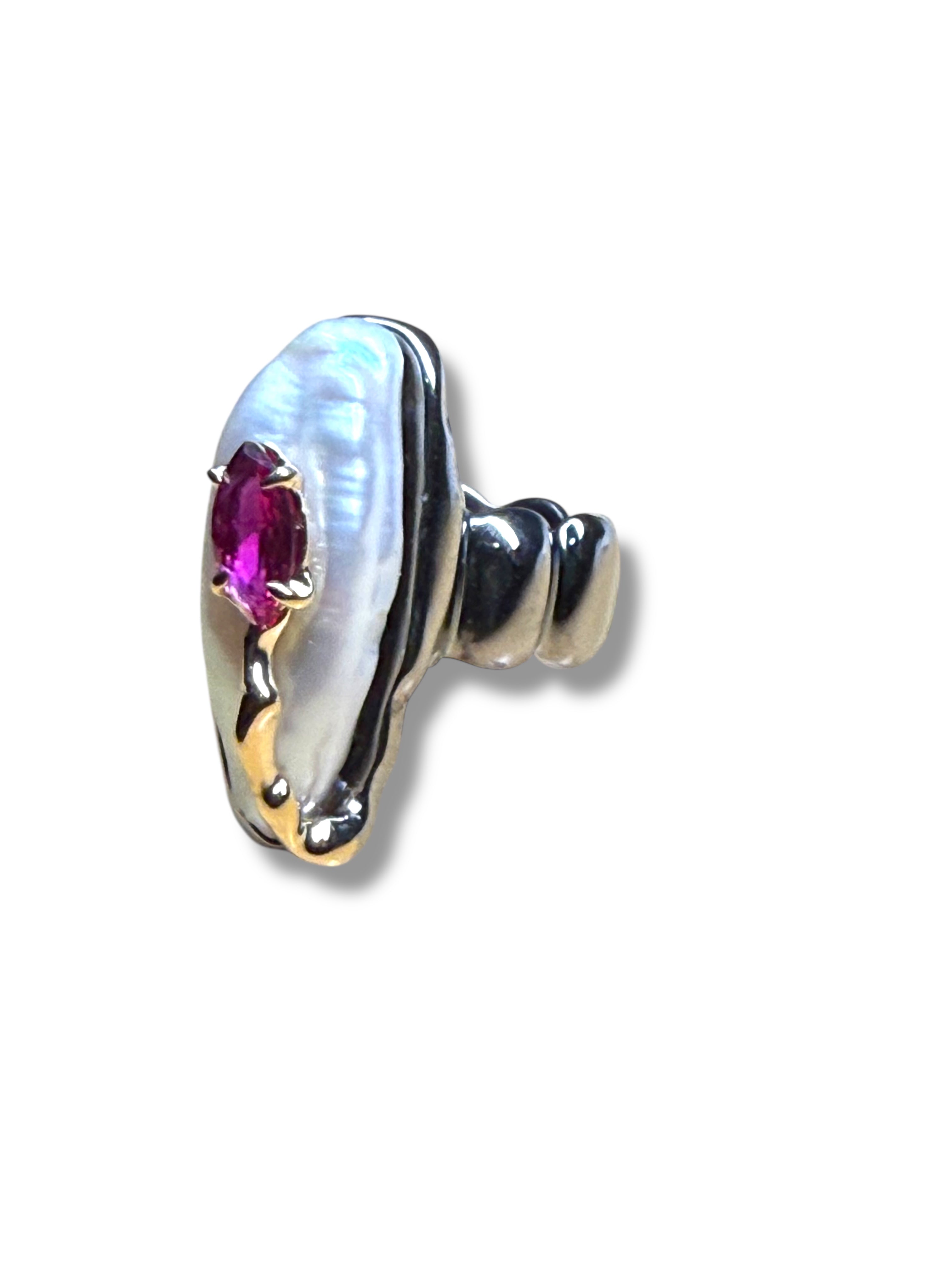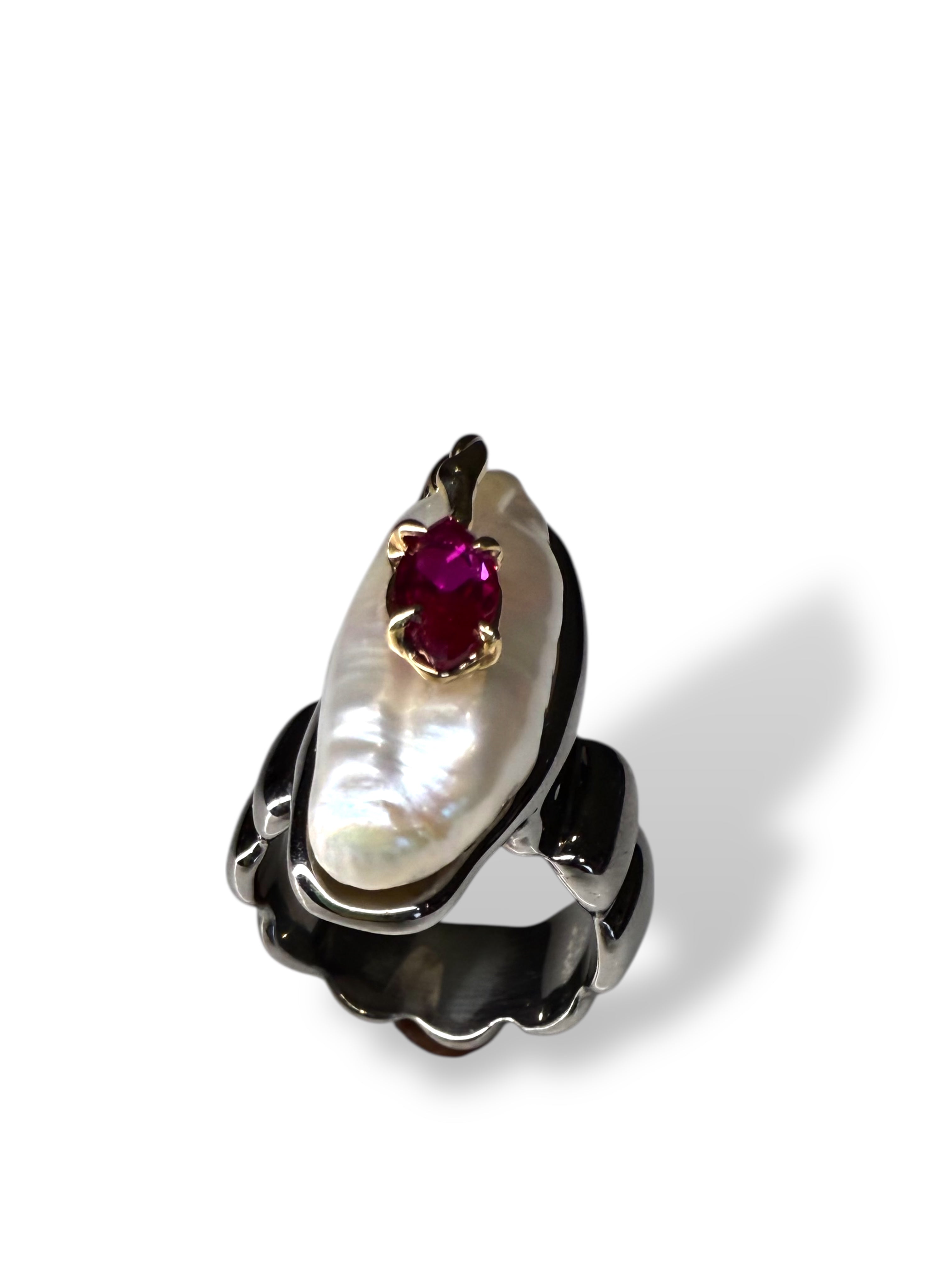 This striking handmade ring combines the luminous glow of a natural pearl with the fiery brilliance of a deep red ruby. Set in a flowing design of rhodium-plated sterling silver, the organic form is accented with 14k gold details, creating a bold yet elegant contrast.