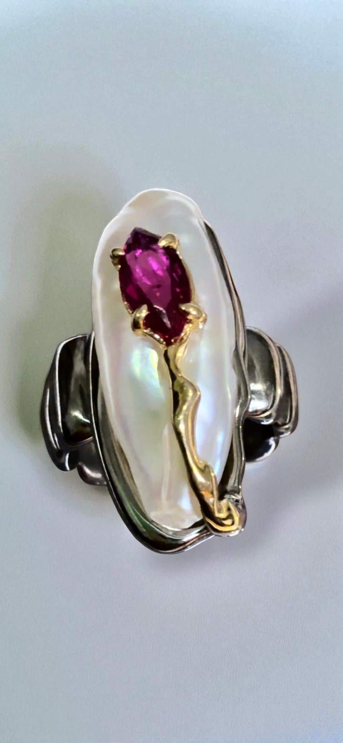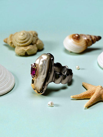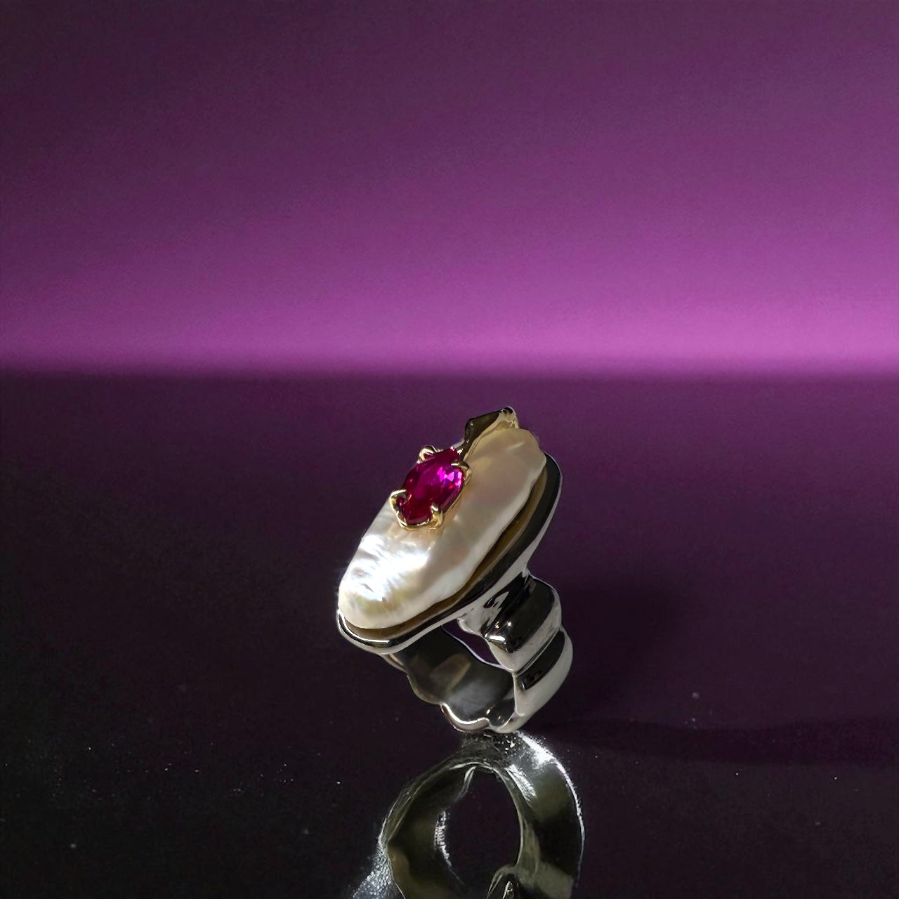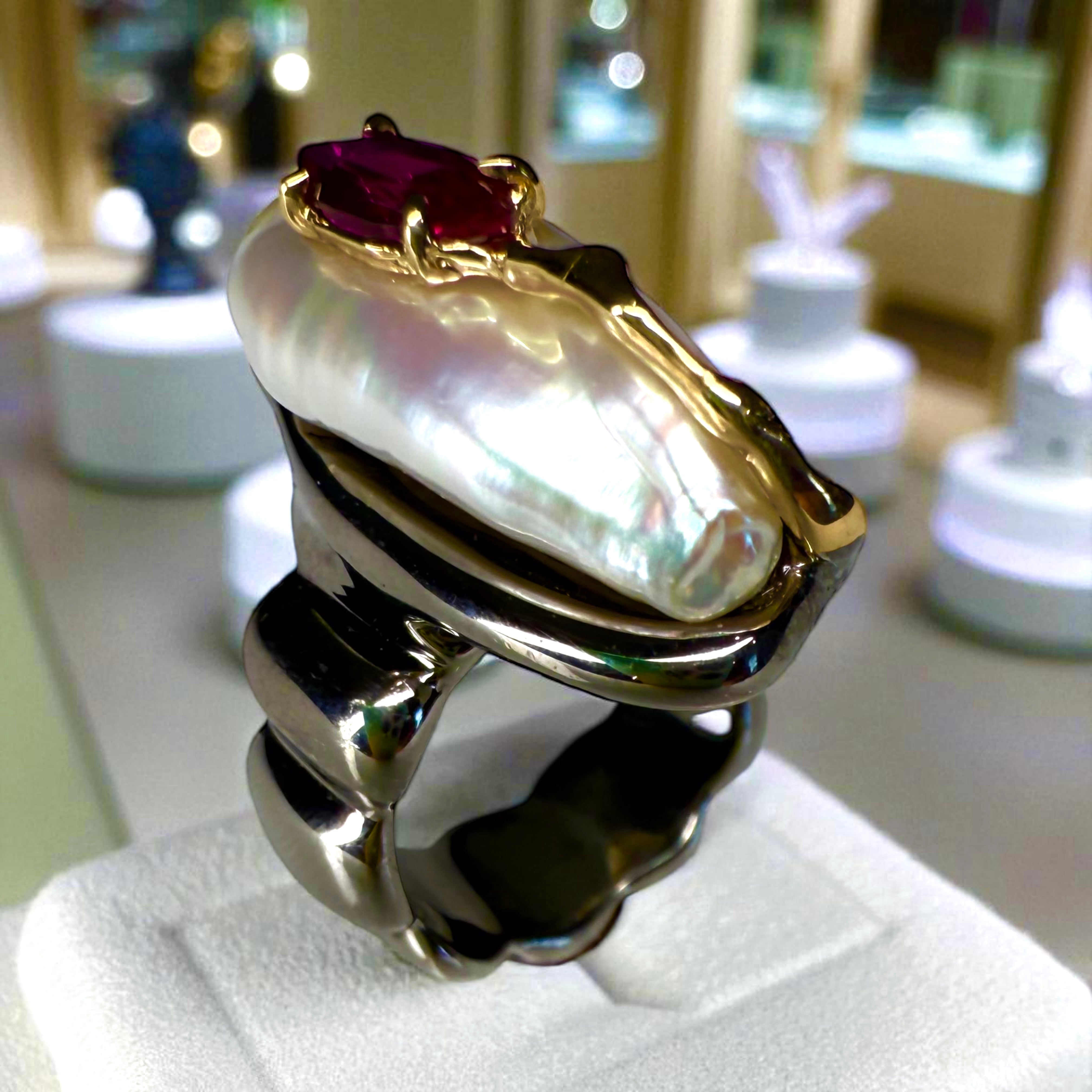 This striking handmade ring combines the luminous glow of a natural pearl with the fiery brilliance of a deep red ruby. Set in a flowing design of rhodium-plated sterling silver, the organic form is accented with 14k gold details, creating a bold yet elegant contrast.