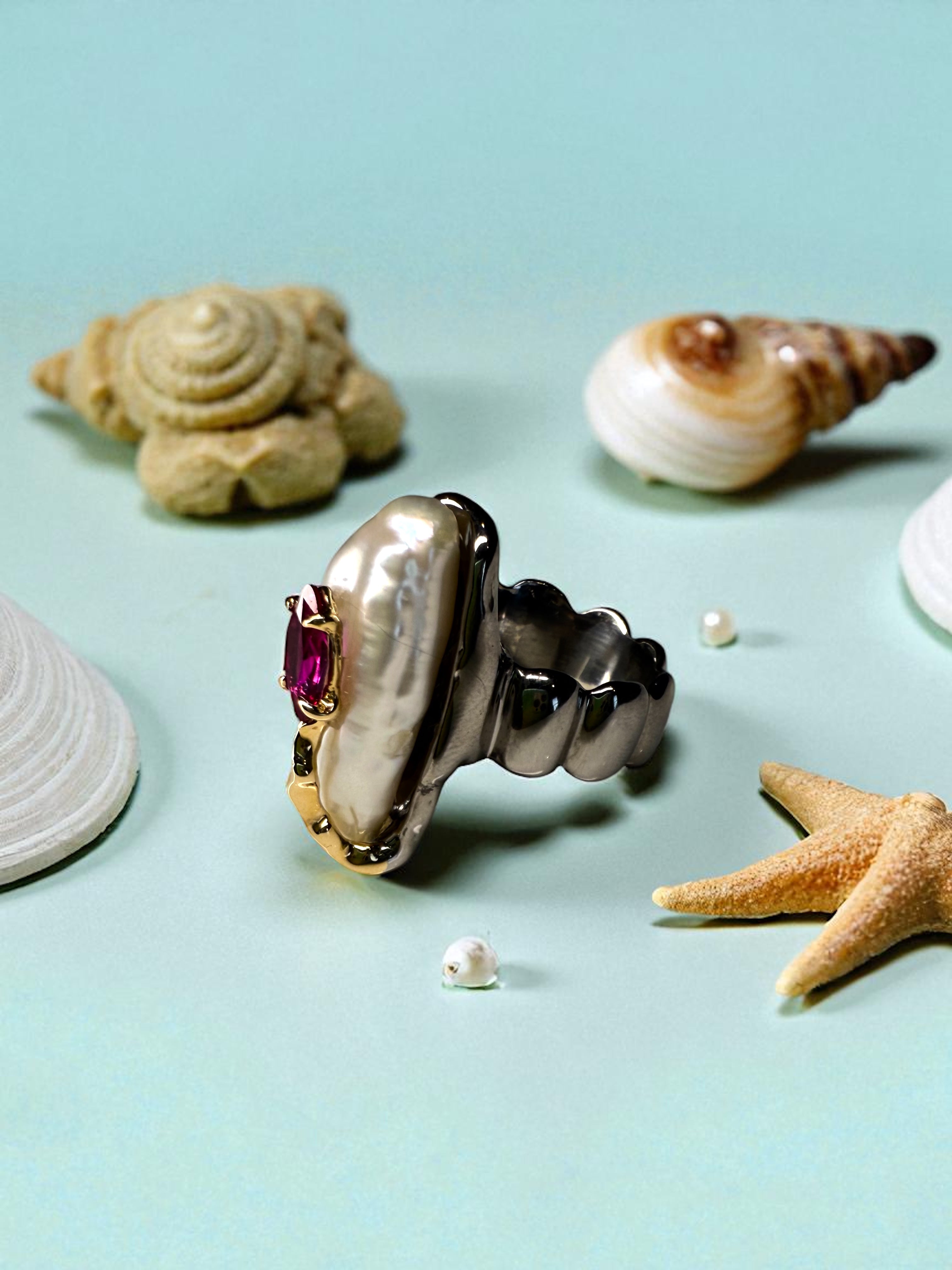 Natural Pearl, ruby, 14 k solid gold, 925 Silver rhodium plated Ring: Ocean-Inspired Design