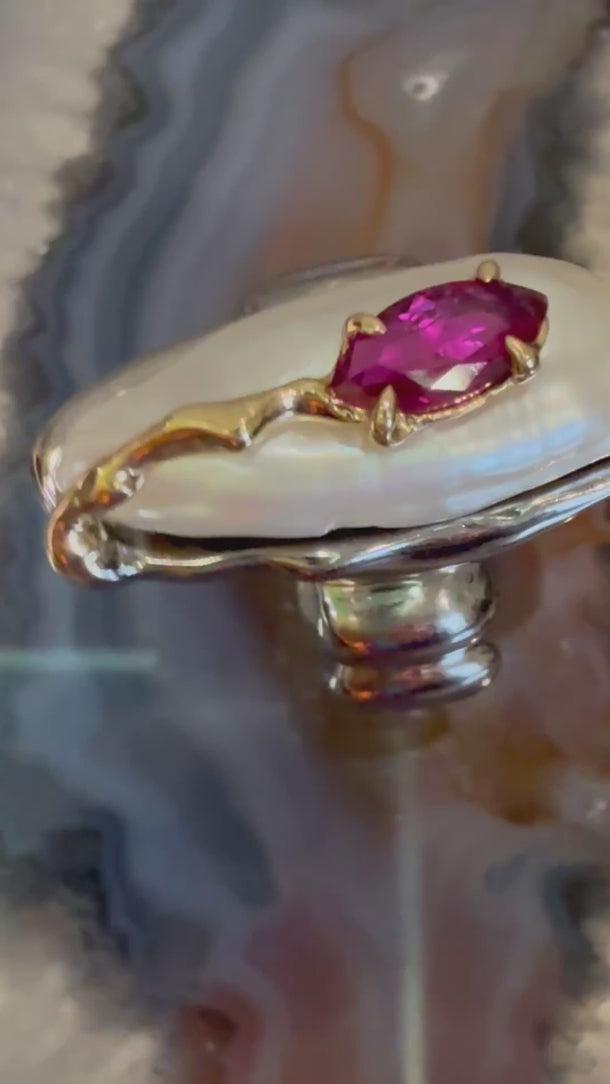 Each piece is individually handcrafted, ensuring that no two rings are ever alike. The natural textures of the pearl and the vibrant marquise ruby make this a true one-of-a-kind treasure.