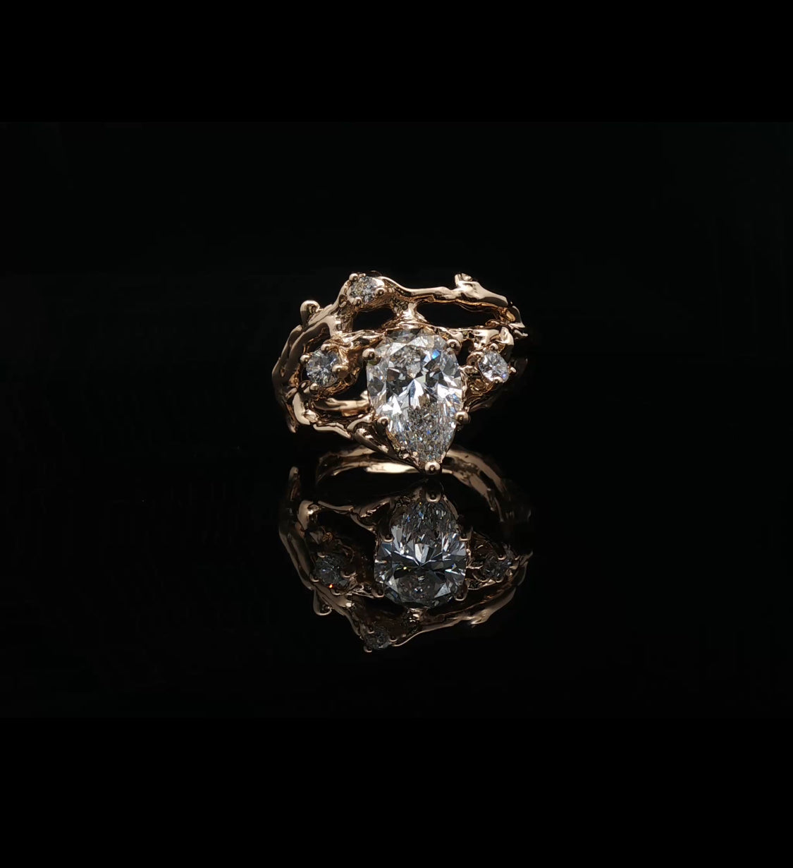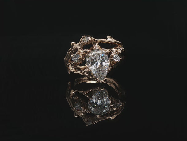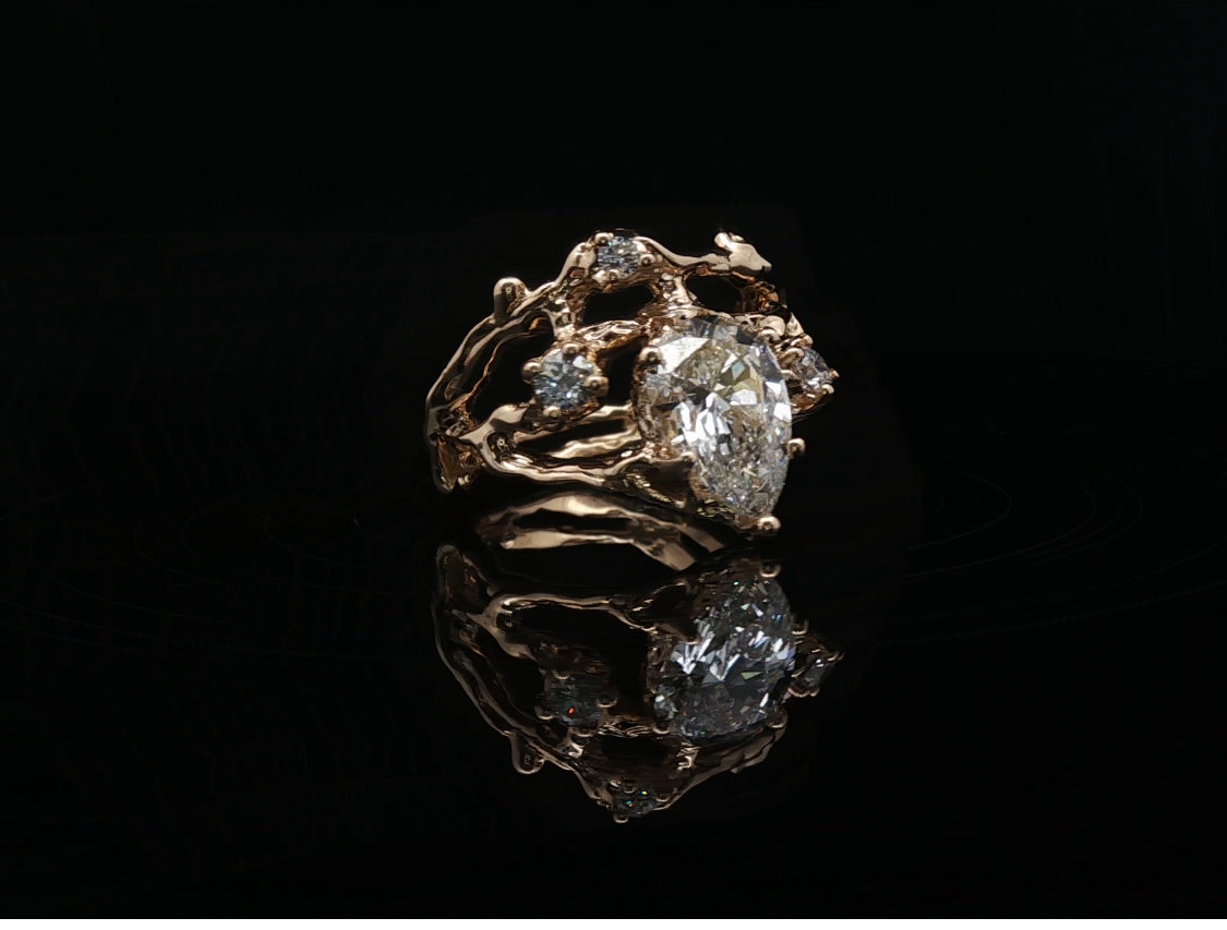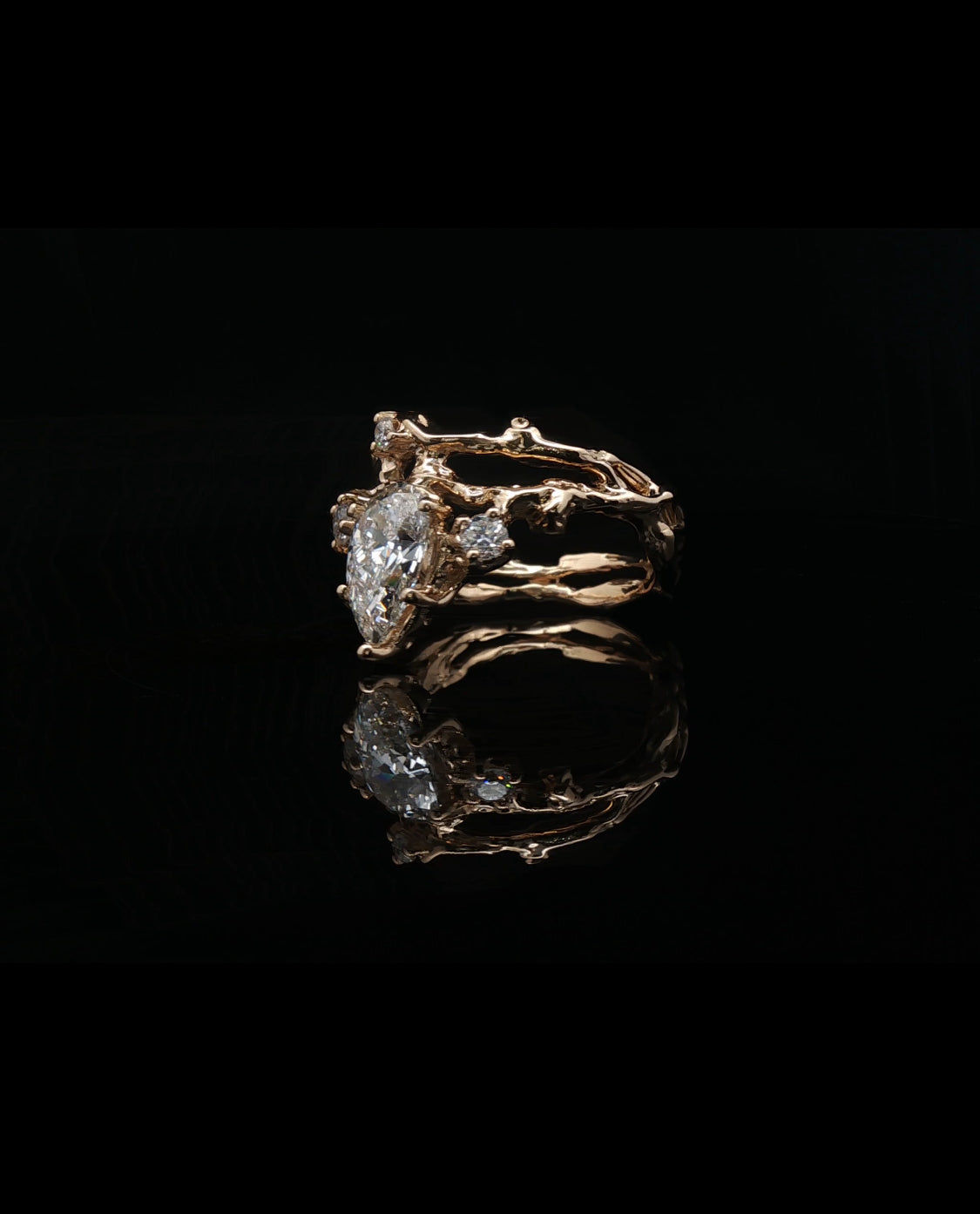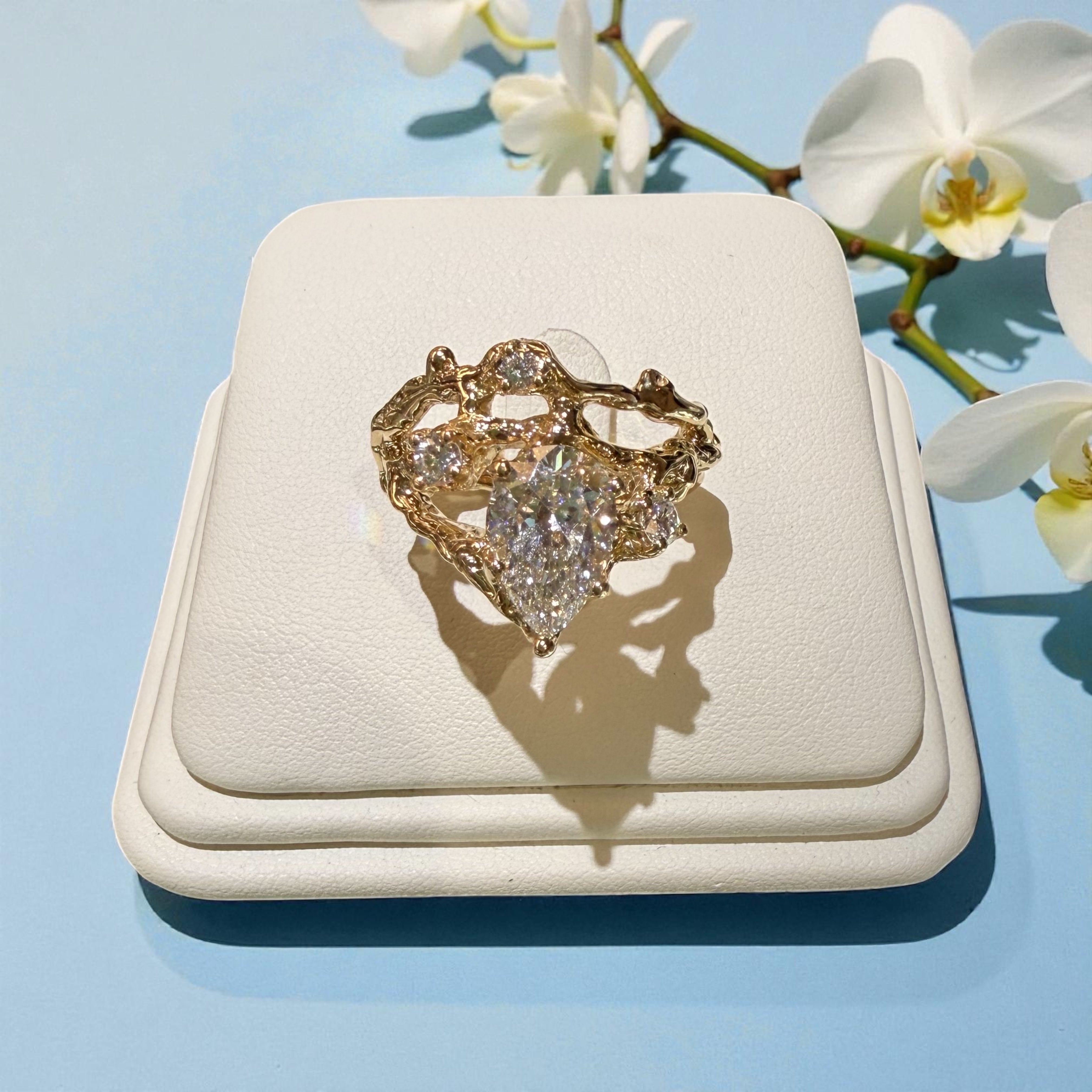 At its center shines a 2ct pear-shaped diamond (VVS1, E color, IGI certified)—a dazzling stone chosen for its brilliance and purity. Smaller accent diamonds are carefully set along the branch-like band, like sparkling drops of morning dew.